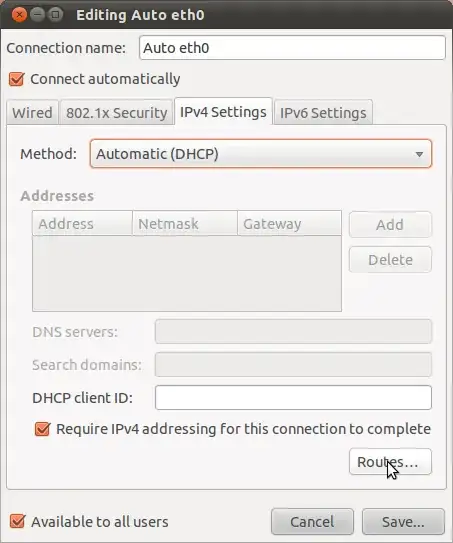 • I found that this also works where the IPv4 Settings > Method is set to Manual, not just for Automatic (DHCP). Why would I try that too? I set it to Manual because my Network Attached Storage device is the only other device connected to my eth0, and it wants a number in the 169.254.x.x block. – Steve Jun 21 '16 at 22:36