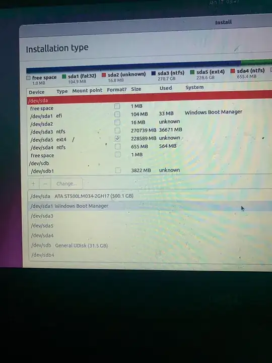 For Device for boot loader installation there are 7 options: /dev/sda ATA ST500LM034-2GH17, /dev/sda1 Windows Boot Manager, /dev/sda3, /dev/sda5, /dev/sda4, /dev/sdb General UDisk, and /dev/sdb4.