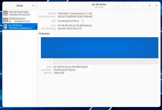 ddon the USB flash drive. – karel Jan 27 '23 at 03:18+button? You should be trying to Format. The Disks screenshot shows us that the hardware is recognized as a storage device, so if the format fails or hangs and never completes then the likelihood is high that the hardware has died. – Nmath Jan 27 '23 at 03:40dddoes weird things to some models of USB flash drives. I tried about 20 different methods over the course of more than a year before I discovered a method of restoring functionality to a USB flash drive after runningddthat actually worked. – karel Jan 27 '23 at 03:44dd. Pendrives are mass produced, and there are lots of evidence of sudden failures. It can happen during any write operation (I would not blamedd). You may find 'a few more tips' at this link, but I think you have done enough to conclude that your pendrive is damaged beyond repair. – sudodus Jan 27 '23 at 13:17ddis risky when cloning drives, but it is mainly because it does what you tell it to do without any question. So if you tell it to overwrite the family pictures, it does so without hesitating. But if you wrap a security overcoat around it, as I do with mkusb, the risk is reduced a lot. Generally, it is a good idea to use tools with a final checkpoint, where you can double-check, that you have chosen the correct target for operations directly onto the drive or its partition table. – sudodus Jan 27 '23 at 17:31ddvia mkusb. When a pendrive is getting 'tired', when the write speed is reduced to less than half of the original one, it is a good idea to wipe the whole device, overwrite it with zeros. It will not only restore the write speed to almost the original one, but it will also reduce the risk of 'gridlock', a failure mode, where the drive hardware becomes read-only. See also this link and links from it. – sudodus Jan 27 '23 at 17:36
