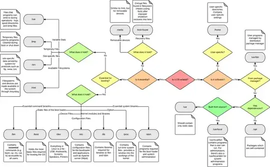When I see it laid out like this, I realise it's no wonder modern distros try to hide this stuff. What a mess (beautiful mess). And I don't agree with this layout completely - it's brilliant, but for example /etc holds application configs as much as O/S configs, so it feels like it should be to the left of the second-from-right-most yellow "User Specific" question as a "no" branch. For example, apache is an application, it's not O/S essential. Neither is Docker, Folding@Home, VMware, or a host of others that use /etc for configs. Great diagram though. – Scaine May 05 '20 at 14:12