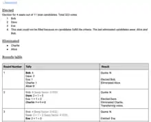 - The result output for STV will look like the presented mockup. It will include details of the method followed for eliminating and electing candidates.