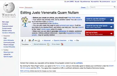 - Search: They search for an article that doesn't exist. From the search results page, they are presented with a redlink to create the page. From this redlink, the user goes directly to the edit page without any introduction to Wikipedia guidelines for new articles. Once they are on the edit page, they are presented with a dense list of bullet points, only one of which (currently) mentions guidelines for content.