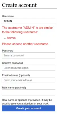 - To verify that it's working, try creating an account for username "Adm1n"; most wikis have an "Admin" account and so AntiSpoof should reject this lookalike username with a message like "The name Adm1n is too similar to the existing account: Admin".
