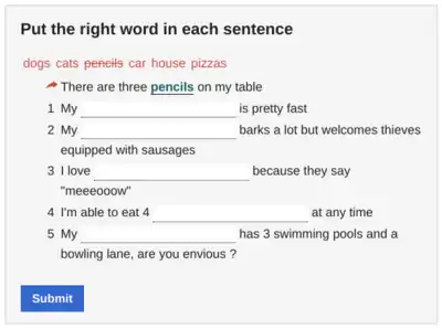 | suggestions = pencils, cats, dogs, car, house, pizzas