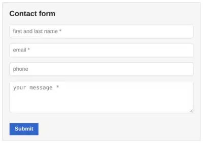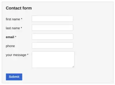 Inputs responsive (two columns), the square brackets contain the input type, the form rows can contain html (the label of the email input is bold)