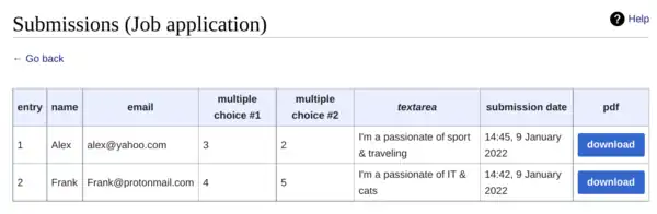 This is an example pdf output of the form above "Job application", either received by email if the parameter email-to is used (see section below for more detail) or clicking the download button in the submissions table.