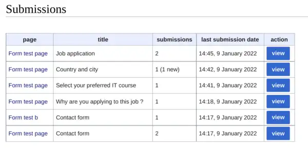 This is a screenshot of the special page Submissions, with the list of form's submissions, grouped by title and the page where the form is placed, throughout the Wiki: