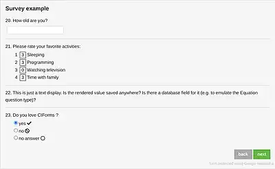 the demo tries to emulate the full list of inputs offered by LimeSurvey however, although CIForms provides native validation whenever possible, it currently misses some input types, specifically the QArray* inputs and conditional display.