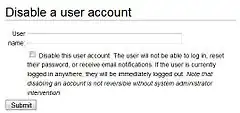 Disabling an account will remove this user's password and email, and place it in an "inactive" user group. It is not reversible without system administrator intervention. To re-enable an account, remove it from the inactive user group, and reset its password using changePassword.php.