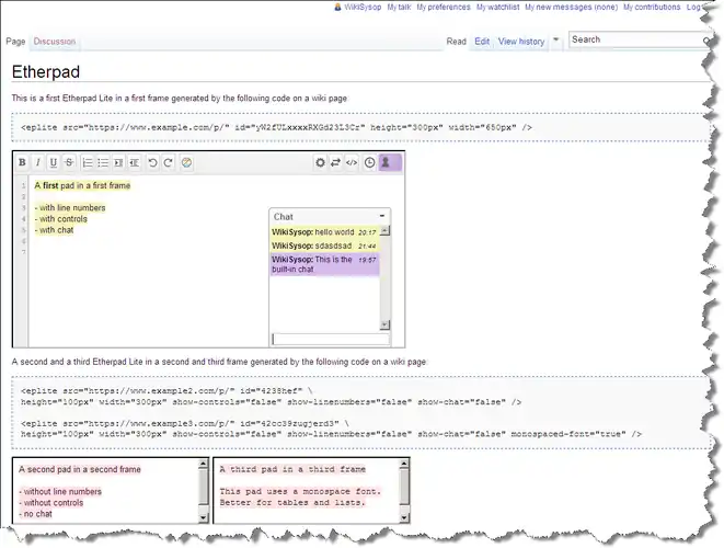Some differently flavoured examples are shown. See screenshot and source code for complete list of parameters. You can determine pad servers, pad names (id), width, height of the window (iframe) on the MediaWiki page and many more parameters. Basically, you only have to indicate a pad name.