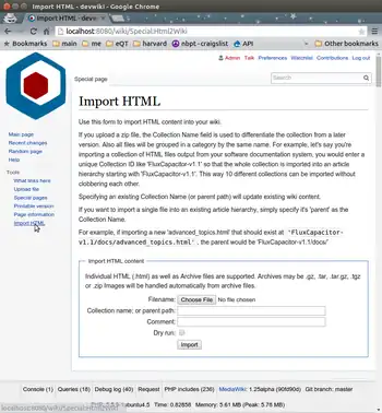 Imagine having dozens, hundreds, maybe thousands of pages of HTML. And you want to get that into your wiki. Maybe you have got a website, or perhaps a documentation system that is in HTML format. You would love to be able to use your wiki platform to edit, annotate, organize, and publish this content. That is where the Html2Wiki extension comes into play. You simply install the extension in your wiki, and then you are able to import entire zip files containing all the HTML + image content. Instead of months of work, you could be done in minutes.