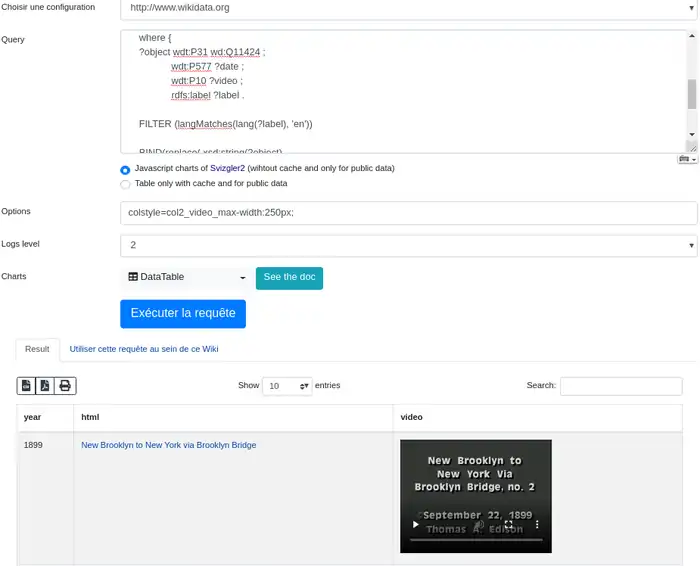 For example with the query "The oldest movies in Wikidata", you can insert video players in the visualization. In this special page, you can test it. This is one of the many possibilities of Sgvizler2.