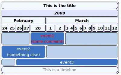 <timelinetable title="This is the title" footer="This is a timeline"> 2009-2-28|2009-3-2|event1|some comment|color: red; 2009-2-24|2009-2-28|event2|something else| 2009-2-26|2009-3-12|event3|| </timelinetable>