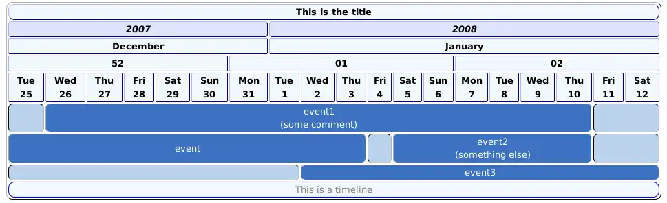 <timelinetable title="This is the title" footer="This is a timeline" depth=day headers=Y/M/W/D-D> 2007-12-26|2008-01-10|event1|some comment 2007-12-25|2008-01-03|event#2008-01-5|2008-01-10|event2|something else 2008-01-2|2008-01-12|event3 </timelinetable>