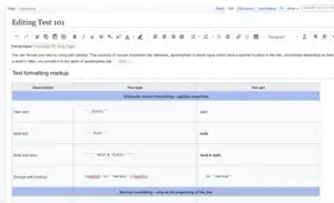 invokes a dialog which allows editing the selected content as wiki text. If nothing is selected then the whole content is inserted into the dialog. Double clicking elements that are formatted by the wiki parser (eg templates, parser functions, switches, comments) will invoke the wiki text editor on these elements. |