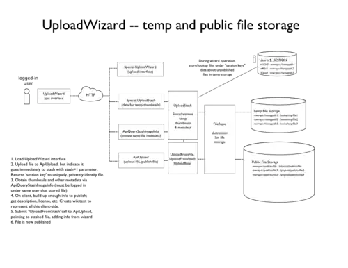 Incidentally, this "stashing" functionality has existed for a while in our base class UploadBase, but extremely similar code is also to be found in the extension FirefoggChunkedUpload, as well as other extensions in various states of upkeep (SpecialUploadMogile, MultiUpload, SemanticForms, and SocialProfile....) UploadStash aims to encompass all the use cases noted above and in most cases should be a drop-in replacement. It also should make other forms of asynchronous uploading (such as Upload By URL) simpler to manage.
