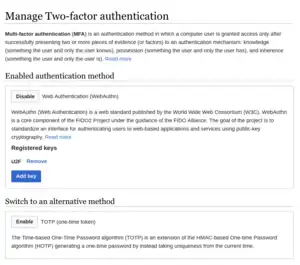 WebAuthn is a module for the OATHAuth extension, that provides support for U2F devices (such as YubiKey) by using the WebAuthn API in browsers. It enables support for logging-in using physical security tokens or biometric sensors along with a regular password. Learn more about U2F on Wikipedia.