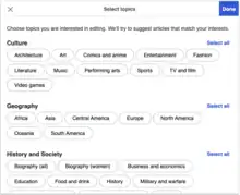 - In the coming weeks, we'll be publishing some information about how other Wikimedians and developers can access these models for their own work. As an example, one way to use them is with the "articletopic" search keyword. This works by typing something like "articletopic:sports" in a Wikipedia search bar to retrieve articles that are likely to be about sports. This page and links from it show the 64 possible topics to search.