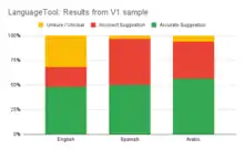 LanguageTool first evaluation (V1 sample): LanguageTool currently supports ~30 languages, so only two of the Growth team pilot languages are supported: Spanish and Arabic. LanguageTool's copy edits were judged at 50% accurate or higher across all three wikis. Suggestions were accurate for 51% of English suggestions, 50% for Spanish, and 57% for Arabic.