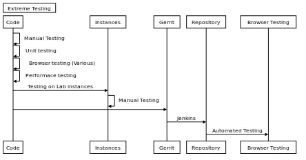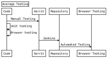 - Automated testing after patch is submitted to Gerrit. This will check patch against jslint, PHP Codesniffer and other syntax errors etc. This procedure (along with release) is well documented at, Continuous Delivery Process diagram[3]