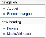 * navigation ** mainpage|Accueil ** Special:RecentChanges|Recent changes * new heading ** portal-url|Forums ** https://www.mediawiki.org|MediaWiki home