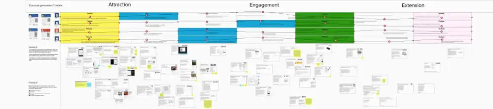 - Workboard with concepts that were chosen from precursors, and generated in the workshop, lined up along persona user journeys: