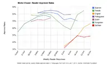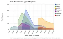 - English and German approval rates are lower than other languages, as Media Viewer was only launched one week ago on their Wikipedia sites (approval rates are usually lower right after launch)