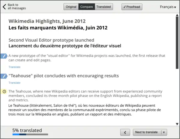 After the Universal Language Selector, Translation UX is the second major development project of the Wikimedia Language Engineering team which involves design and user testing efforts. Pau Giner and Arun Ganesh have come up with new designs for three parts of the translator's workflow: signup, translation and search. In this document each of these three parts are called a track. Each track will be described in its section below.