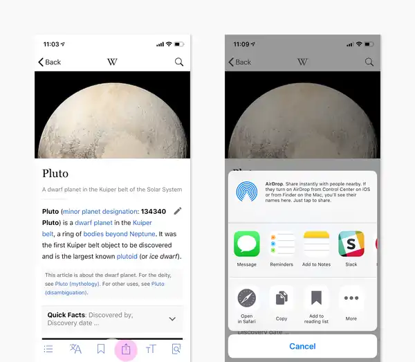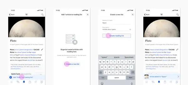 When saving an article, a shortcut appears at the bottom of the screen. Tap the shortcut to create and organize saved pages into reading lists.