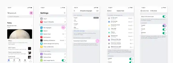 Both apps present information from various languages in a card-based feed we call Explore. This is because mobile apps do not present content on small phones in the "web page template" style that websites do. So we take the content from those main pages that volunteers own and create, and we present that as cards in an easily scrollable and customizable feed.
