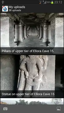 • A text like "3 images" and a list of the images you have uploaded previously to Wikimedia Commons. The most recent is the top. The description of each image is shown below it. If an image has no description the text “No image description” is shown.