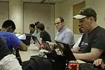 Regular contributors plus some newcomers hack together with a shared goal.