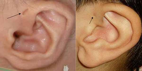 Other features of Emanuel syndrome include an unusually small head (microcephaly), distinctive facial features, and a small lower jaw (micrognathia). Ear abnormalities are common, including small holes in the skin just in front of the ears (preauricular pits or sinuses). About half of all affected infants are born with an opening in the roof of the mouth (cleft palate) or a high arched palate. Males with Emanuel syndrome often have genital abnormalities. Additional signs of this condition can include heart defects and absent or unusually small (hypoplastic) kidneys; these problems can be life-threatening in infancy or childhood.