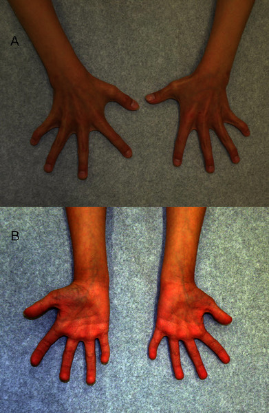 Additionally some affected individuals have finger abnormalities that include short fingers (brachydactyly), widened and rounded tips of the fingers (clubbing), and curved pinky fingers (fifth finger clinodactyly). Other features of Floating-Harbor syndrome can include an unusually high-pitched voice and, in males, undescended testes (cryptorchidism).