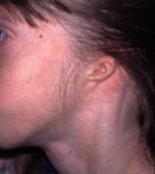 People with focal dermal hypoplasia have skin abnormalities present from birth, such as streaks of very thin skin (dermal hypoplasia), yellowish-pink nodules of fat under the skin, areas where the top layers of skin are absent (cutis aplasia), small clusters of veins on the surface of the skin (telangiectases), and streaks of slightly darker or lighter skin. These skin changes may cause pain, itching, irritation, or lead to skin infections. Wart-like growths called papillomas are usually not present at birth but develop with age. Papillomas typically form around the nostrils, lips, anus, and female genitalia. They may also be present in the throat, specifically in the esophagus or larynx, and can cause problems with swallowing, breathing, or sleeping. Papillomas can usually be surgically removed if necessary. Affected individuals may have small, ridged fingernails and toenails. Hair on the scalp can be sparse and brittle or absent.