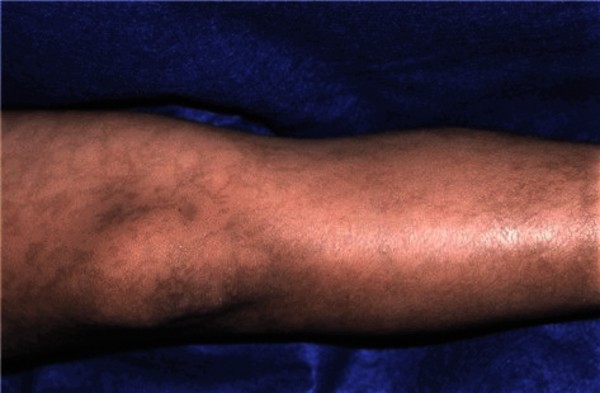 ) that occur in a swirled pattern. These patches, which can occur anywhere on the body, fade with time. Adults with incontinentia pigmenti usually have lines of unusually light-colored skin (hypopigmentation) on their arms and legs. These markings follow the paths along which cells migrate as the skin develops before birth (called the lines of Blaschko).