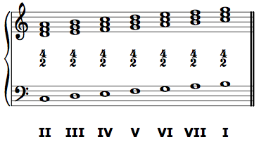 Chords of the sixth that take the figure 6/4/2 (or its abbreviation 4/2 or simply 2) are third-inversion chords. Their root is a second, or a step, above the bass. The most common 4/2 chord has fa in the bass, and sol is its root, making its Roman numeral V.