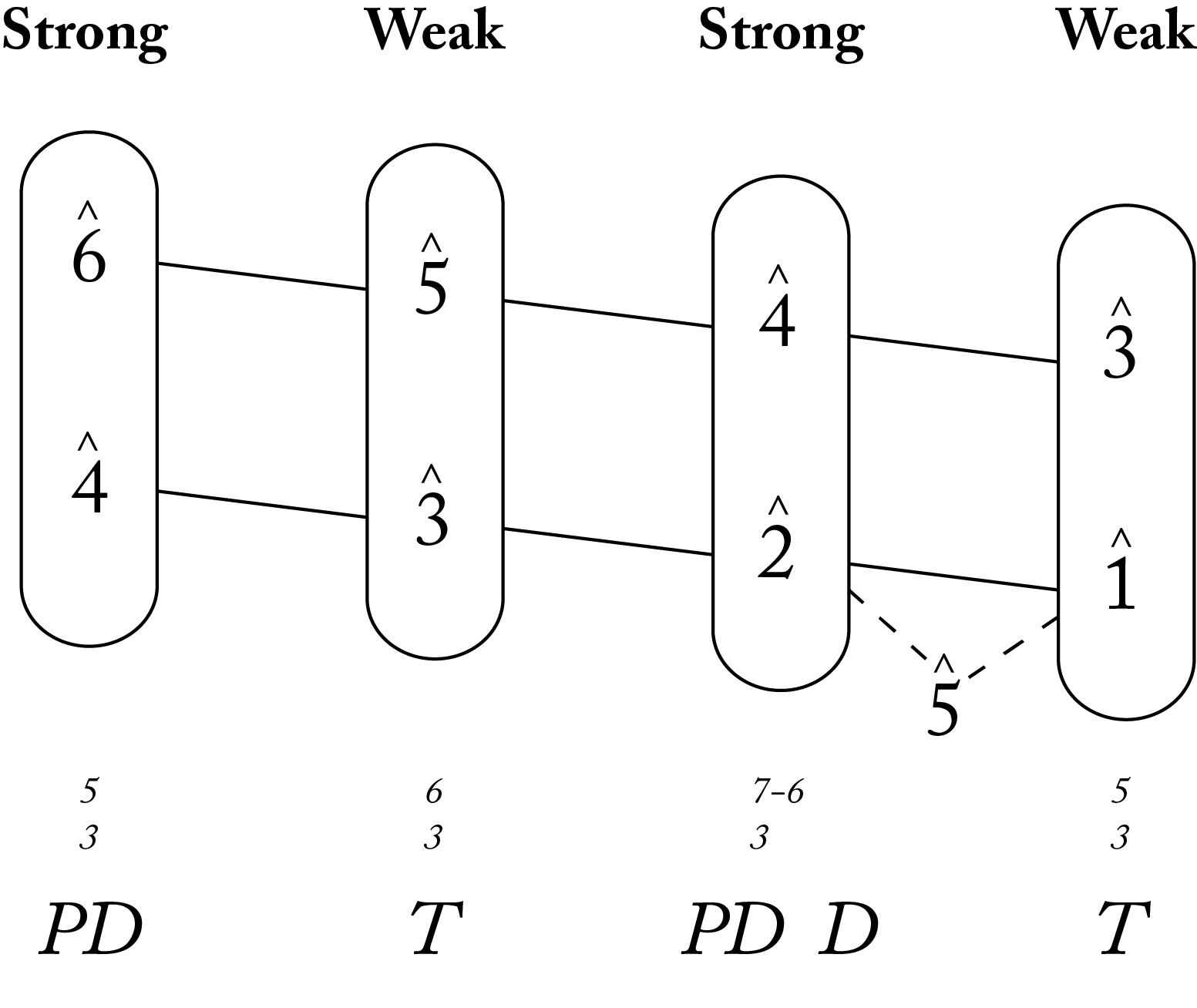 The Prinner has four stages corresponding to four bass notes: fa –mi/me – re – do. The skeleton of the Prinner’s melody typically accompanies the bass in parallel tenths: la/le – sol – fa – mi/me. Harmonically, the fa and do bass notes tend to take 5/3 chords while the two middle bass notes, mi/me and re, take 6/3 chords.