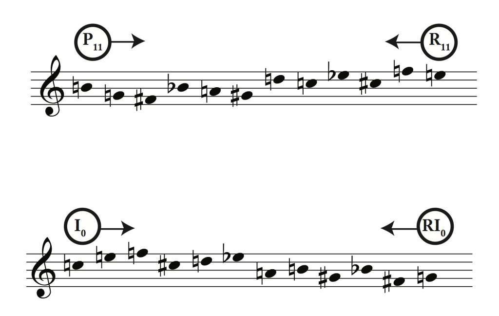 Prime forms and inversion forms can be also be played backwards, also called retrograde. In the example below notice how this work in relation to the P11 and I0 rows from above. When a P-form is retograded, we call it a “R-form.” When an I-form is retrograded, it’s called an “RI-form.” As the example shows, R- and RI-forms are labeled according to their last pitch class.