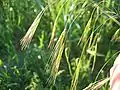 the barren bromegrass flowers are pollinated by the wind. They are greenish, with no petals nor sepals, and very long stamina and pistil.