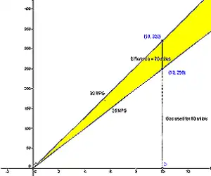 What this graph shows us is the predicted range of miles we can drive on a given amount of gas. The more gas we have, the more likely our actual mileage is going to be different from what the sticker on our car predicted. If our actual mileage falls outside of this range than we may want to take our car to a mechanic to make sure everything is running correctly on our car. If your mileage is too high the odometer on your car may be broken. If your mileage is too low your car might need a tune up.