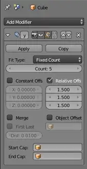 The cube will immediately become two cubes, but so close together that they look like a single cuboid. This is because the default settings for the Array modifier are to use a Relative offset of (X, Y, Z) = (1.0, 0.0, 0.0). Change these offsets to (1.5, 1.5, 1.5), so the copies are more widely separated at a more interesting angle, and increase the repetition count to 5.