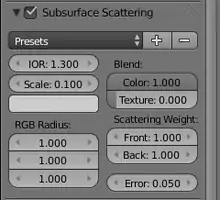 - The RGB Radius values govern how far the red, green and blue components of the light penetrate into the material before being scattered. These are relative values, all subject to the overall Scale factor.