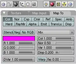- The button Col in the Map To Panel uses the RGB information of the image to change the color of the material.