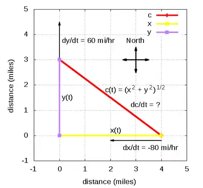 For example, one can consider the kinematics problem where one vehicle is heading west toward an intersection at 80mph while another is heading north away from the intersection at 60mph. One can ask whether the vehicles are getting closer or further apart and at what rate at the moment when the northbound vehicle is 3 miles north of the intersection and the westbound vehicle is 4 miles east of the intersection.