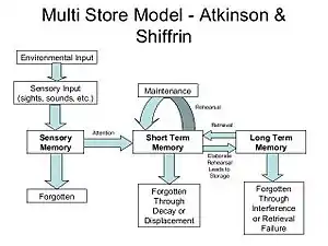 Memory structure is first introduced by Richard Atkinson and Richard Shiffrin in 1968. They created the modal model, which was also known as information processing model, to distinguish control processes and memory structures. Control processes are basically the specific processes that information stored, such as, encoding, retrieval processing. The human memory structure is consisted of three separate components, sensory memory, short-term memory and long term memory.[25] Each component has a specific function, on the whole, memory structures allow us to process and move information around in our brain. One criticism that worthy to mention is that the modal model maybe not just a unidirectional flow, the actual information processing is more complex.[26] Next, let's look at how sensory memory, working memory and long term memory interact and influence each other.