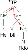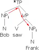 The last of the set to deal with, after anaphors and pronouns, is R-expressions, the whole set of nouns and phrases that aren’t anaphors nor pronouns. At first it seems like we shouldn’t need to describe where these can go at all, given our previous rules, but we can find perfectly ungrammatical sentences that don’t break either Principle A or B.