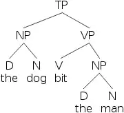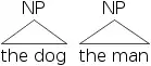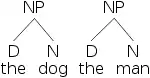 More common for showing the structure of a sentence is the tree diagram. In trees, constituents are represented by nodes connected by lines. Lines connect up from one constituent to another that encloses it. The nodes themselves are the type (N, NP, V, VP, etc.). Heads (N, V, etc.) often have the actual word written below them. The tree versions of [NP [D the] [N dog]] and [NP [D the] [N man]] are shown below.