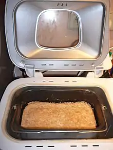 A bread machine or breadmaker is a home appliance for baking bread. It handles the process from ingredients to a finished loaf, automatically. The machine consists of a bread pan with a paddle mounted in the centre, in a special purpose oven, with a control panel.