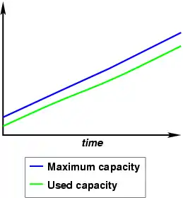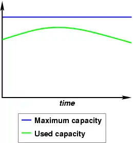 Figure 1: The progression of an individual's maximum normal capacity (in effect how large is the supply of serotonin), and the actual used capacity (how much serotonin is effectively used), during the course of an extended period. Notice that there moments when the demand is higher, perhaps because of extra work, but that the maximum capacity was never breached.